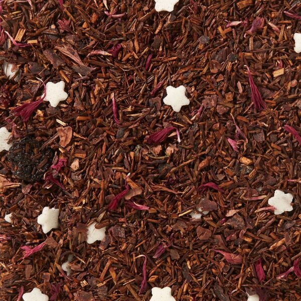 Rotbuschtee, Kakaoschale, Zuckersterne weiß (Zucker, Reismehl, Reisöl, Kartoffelstärke, Aroma), Aroma, gefr.-getr. Sauerkirschstücke, ganze Sauerkirschen, rosa Kornblumenblüten